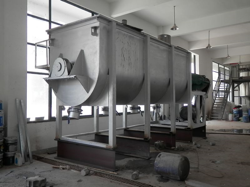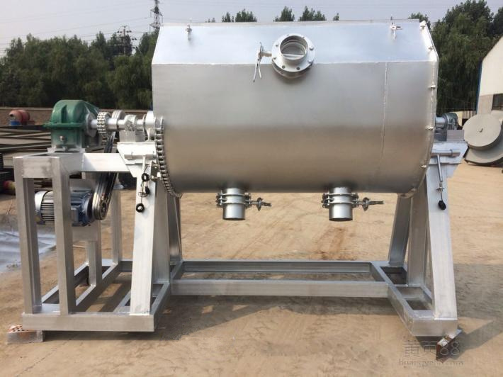 本產(chǎn)品采用U型外觀設(shè)計,內(nèi)部采用雙層螺帶設(shè)計。即在水平的主軸上裝有兩條或多條輸送能力相同,螺徑不同,螺轉(zhuǎn)方向不同的螺帶。通常是當主軸轉(zhuǎn)動時,一條螺帶把物料從左至右輸送,另一條螺帶把物料從右至左輸送。因而在機內(nèi)發(fā)生對流穿插混合作用,達到混合均勻的目的。